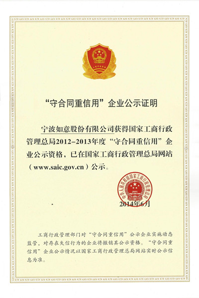 近日,如意公司獲得了國家工商行政管理總局授予的“全國AAA級守合同重信用企業(yè)”稱號,這是公司繼2003年以來第三次榮獲該稱號。